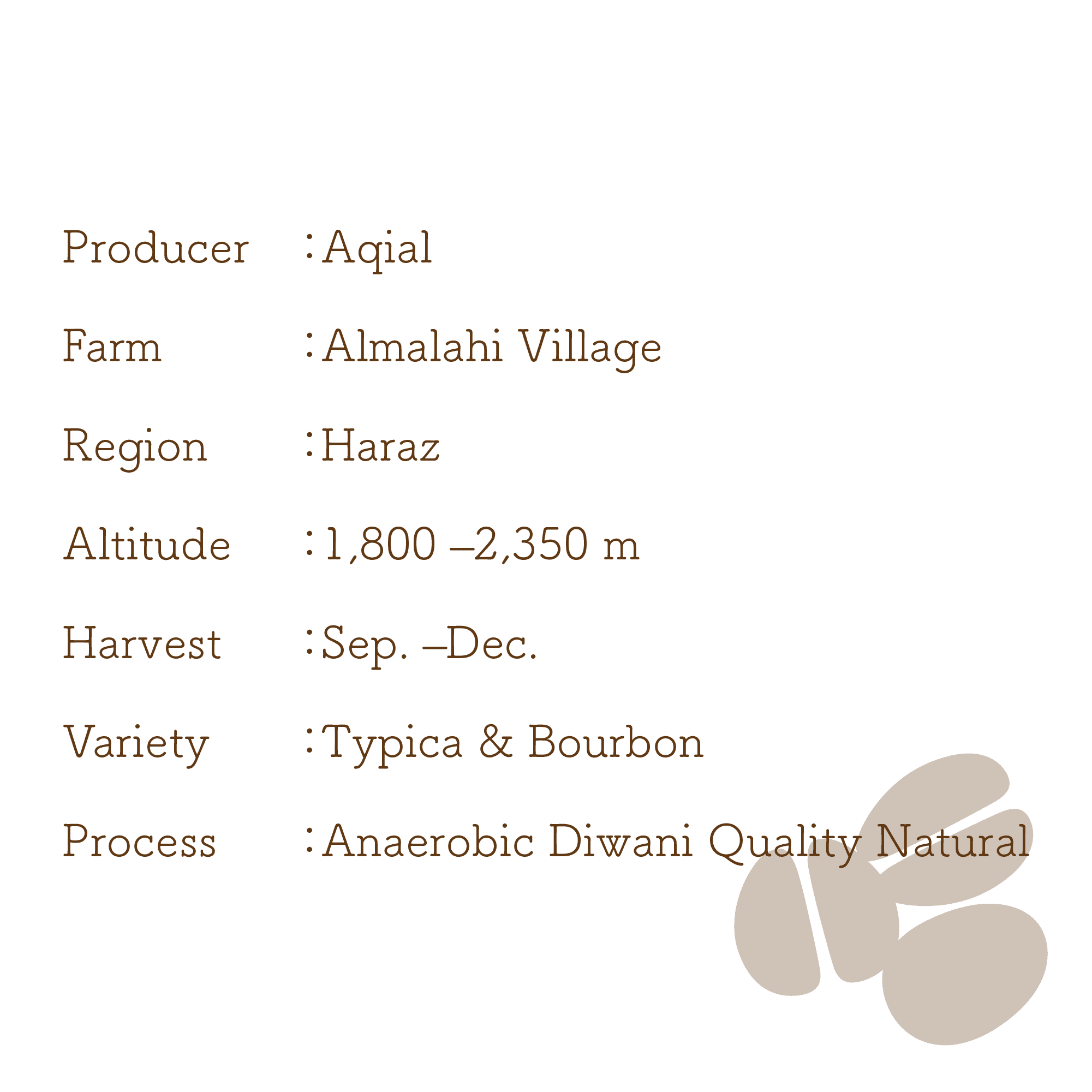 DQ(ディワニ・クオリティ)プロセスと称される新しい嫌気性処理方法で、ハラズ独特の環境下に由来するフルーティなフレーバーと複雑な特徴を促進することに重点を置き、従来の加工方法ではまだ味わうことが出来ない味わいです。透明感がありつつ、しっかりとした甘さのあるロットです。イエメンのトップロットはなかなか手に入りづらいので、この機会に是非お楽しみ下さい!